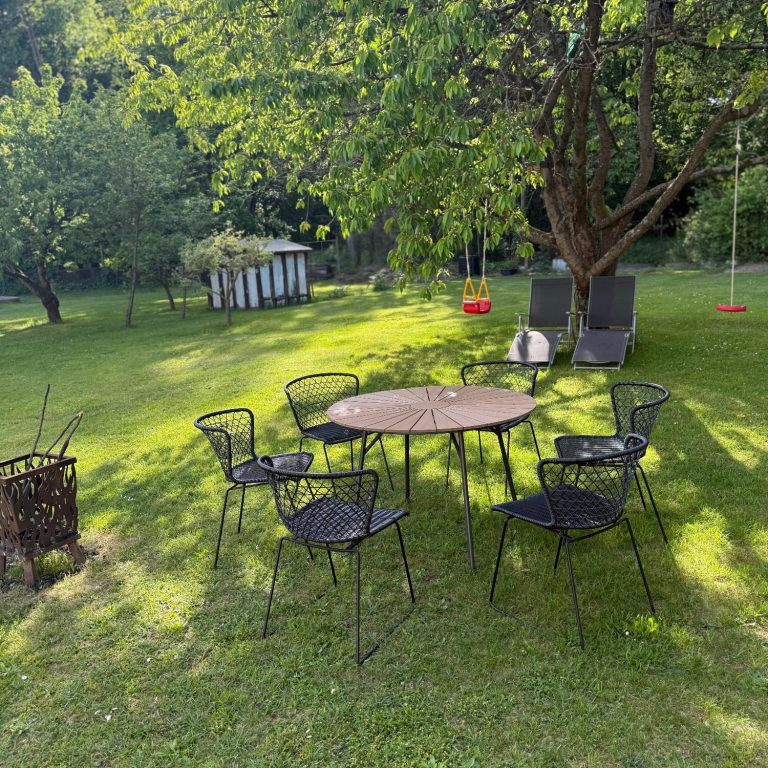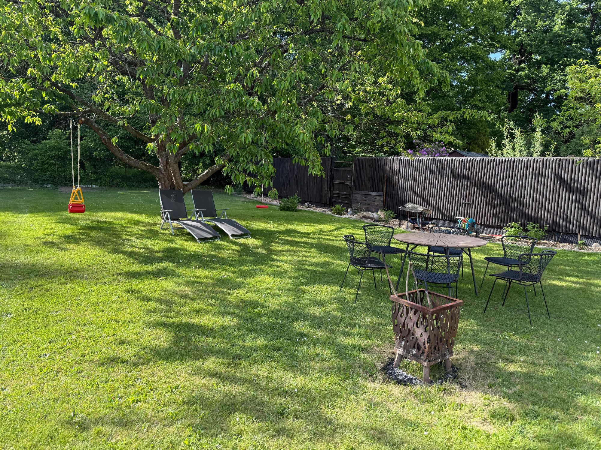 ... lädt mit Sitzmöglichkeiten und Sonnenliegen zum Entspannen ein, und ein Gasgrill steht ebenfalls zur Verfügung. Auch gibt es eine Feuerstelle für gemütliche Abende. Der Garten hat einen direkten Zugang zum wunderschönen, alten Uhyster Schloßpark.